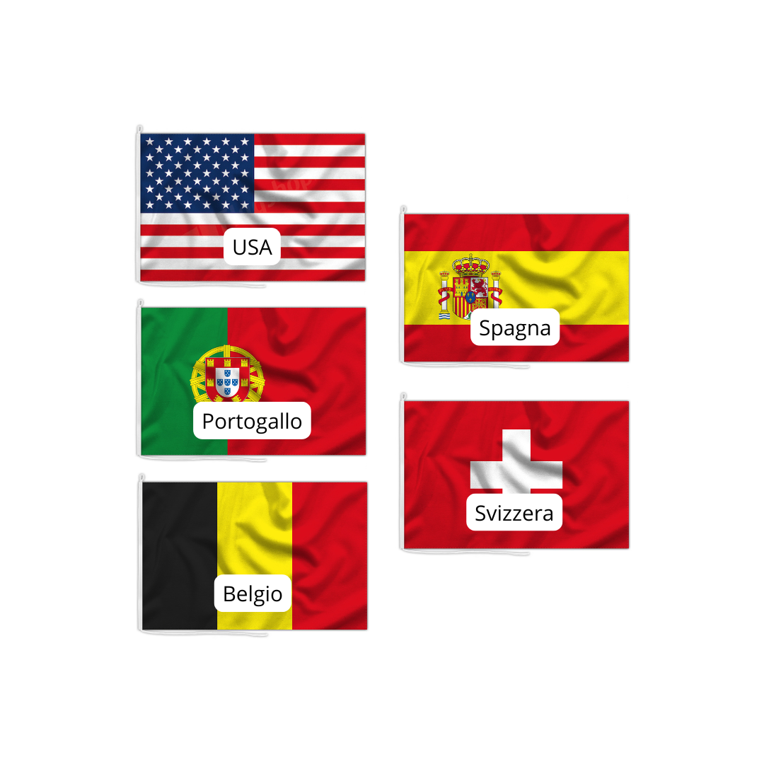 BANDIERE COMPRESE NEL SET: Italia - UK - Francia - Spagna - Germania - Portogallo - Paesi Bassi - USA - Svizzera - Belgio