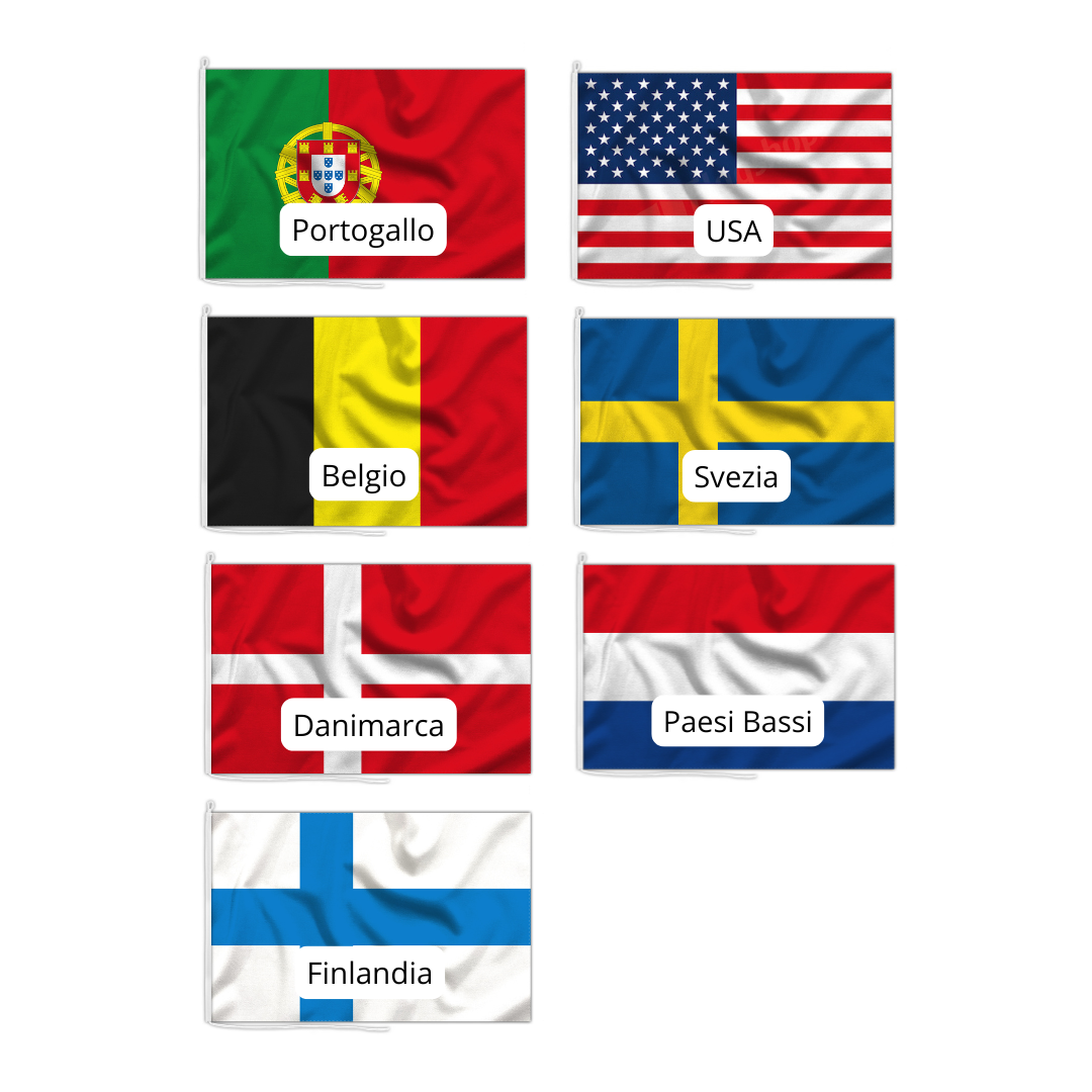 BANDIERE COMPRESE NEL SET: Italia - UK - Francia - Spagna - Germania - Portogallo - Paesi Bassi - USA - Svizzera - Belgio - Danimarca - Finlandia - Svezia - Grecia - Croazia